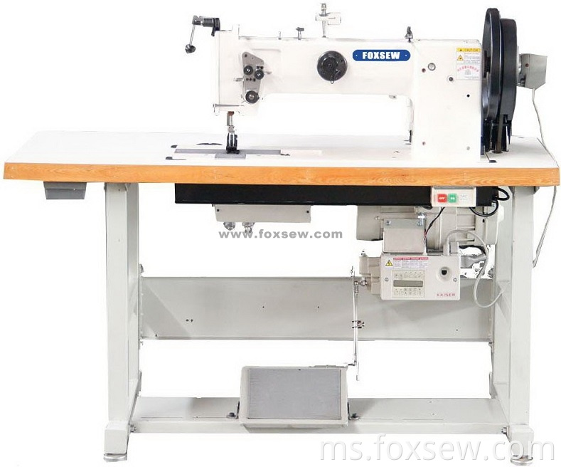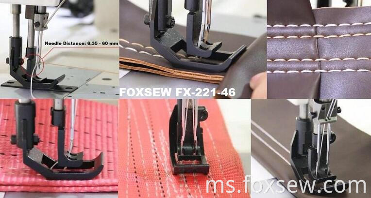 Foxsew FX-221-46 Long ARM Double Needle Bed Flat Triple Feed Walking Foot Extra Heavy Duty Lockstitch Mesin untuk Upholstery dan Webbings Heavy Duty, untuk menjahit bahan berat berat tambahan seperti kulit, sofa, kanvas, vinil, sintetik, dan pelbagai Kain bersalut, berlamina dan getah. Sesuai untuk menjahit seperti khemah, tarps, awning, penutup trak, pelapis marin dan perabot auto, penutup lapangan, struktur kain dan produk besar yang berat.