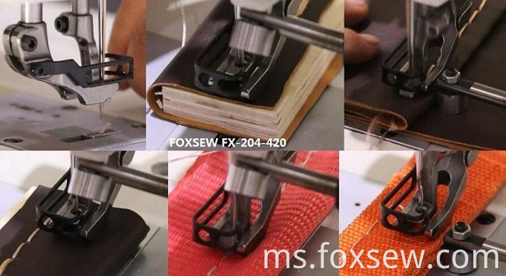 Ciri-ciri: Walaupun menjahit dengan panjang jahitan panjang dan benang tebal, FX-204-420 dicirikan oleh corak jahitan yang sangat baik dan pembentukan jahitan yang ketat, untuk reka bentuk yang sangat kukuh bahagian mekanikalnya dan tindakan pemakanan yang dipertingkatkan. Mesin ini dengan cangkuk ulang -alik silinder berat direka untuk memproses benang dan bahan yang melampau, seperti pembuatan barangan kulit, tekstil khas, sofa, perabot, kusyen kerusi kereta, upholsteri kereta, khemah, abah -abah, pelana, dan industri hiasan.